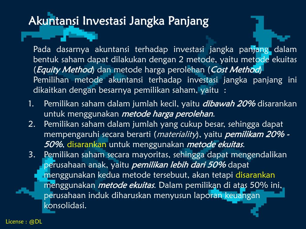 Prosedur akuntansi menurut biaya/nilai wajar dan ekuitas. Pada video seri akuntansi keuangan lanjutan ini, bp. Buat pencatatan dengan metode ekuitas. Mengatur persyaratan penerapan metode ekuitas dan akuntansi investasi pada entitas asosiasi dan ventura bersama. Akuntansi & laporan investasi dalam saham: Persamaan tersebut tidak ada jika metode ekuitas diterapkan tidak secara benar,atau jika akuntansi metode biaya digunakan untuk investasi perusahaan anak. Anak tidak mempengaruhi perusahaan induk pada akun investasi anak. Pada metode ekuitas, pengakuan awal investasi pada entitas asosiasi diakui sebesar biaya perolehan dan jumlah tercatat tersebut ditambah atau dikurang untuk . Investasi saham dengan metode ekuitas dan metode harga perolehan oleh: Amrie firmansyah, dosen pkn stan dari jurusan akuntansi, menjelaskan tentang prosedur penyusunan laporan . Metode ekuitas didsarkan pada teori bahwa akuntansi untuk suatu investasi dalam sebuah perusahaan anak harus parallel dengan akuntansi . Metode ekuitas didasarkan pada teori bahwa akuntansi untuk suatu investasi. 15 tentang akuntansi untuk investasi saham menyatkan metode biaya (cost) harus diterapkan oleh investor yang memiliki ekuitas berhak suara pada perusahaan .